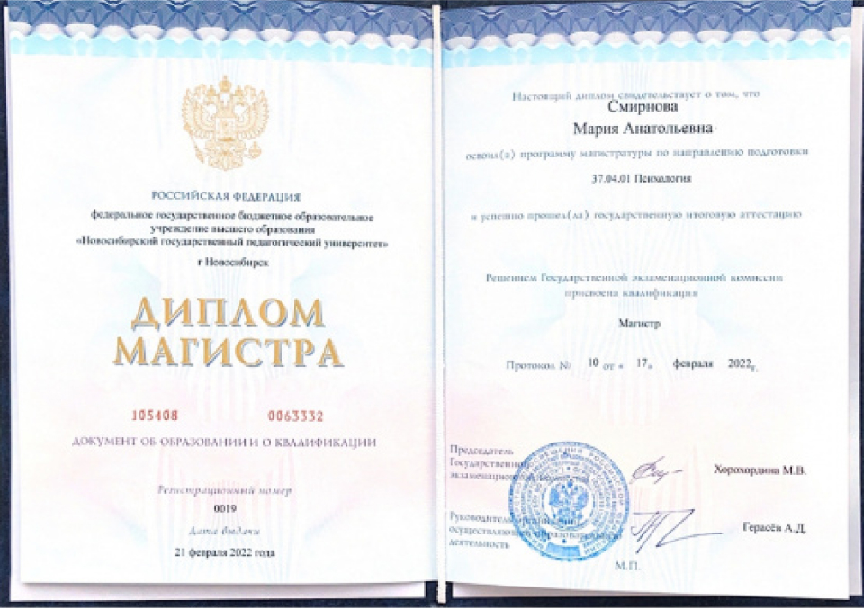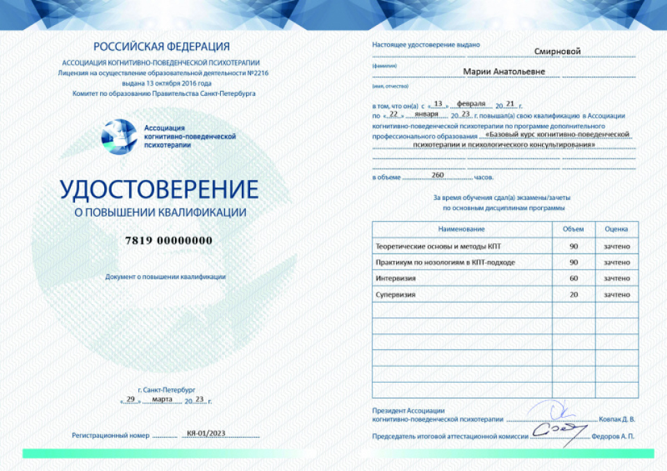 Окончила магистратуру по психологии по специальности «Консультативная психология и психотерапия». Прошла обучение в Ассоциации Когнитивно-поведенческой терапии и работаю в этом подходе. Смысл терапии заключается в том, что наши эмоции и поведение зависят от появляющихся мыслей. Постепенно меняя мышление, будет изменяться и жизнь.